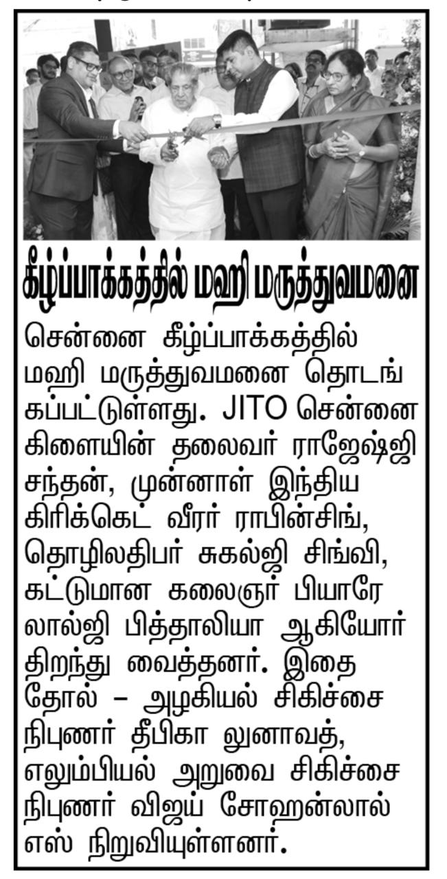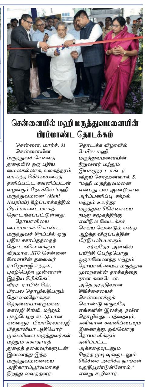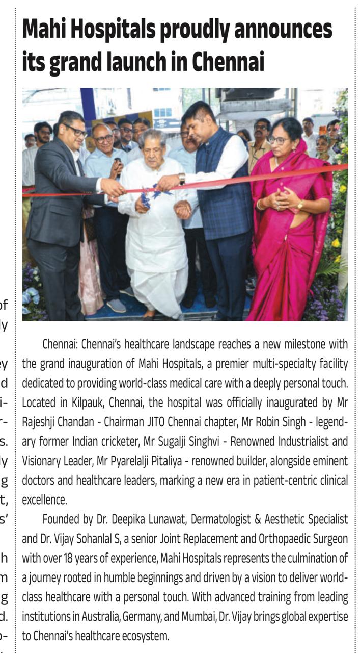 Strategically located in Kilpauk, MAHI Hospitals aims to provide comprehensive healthcare services with a blend of modern technology and compassionate treatment. The launch event was graced by prominent personalities including Mr. Rajeshji Chandan, Chairman of JITO Chennai Chapter, former Indian cricketer Mr. Robin Singh, renowned industrialist Mr. Sugalji Singhvi, and respected builder Mr. Pyarelalji Pitaliya, along with several eminent doctors and dignitaries.