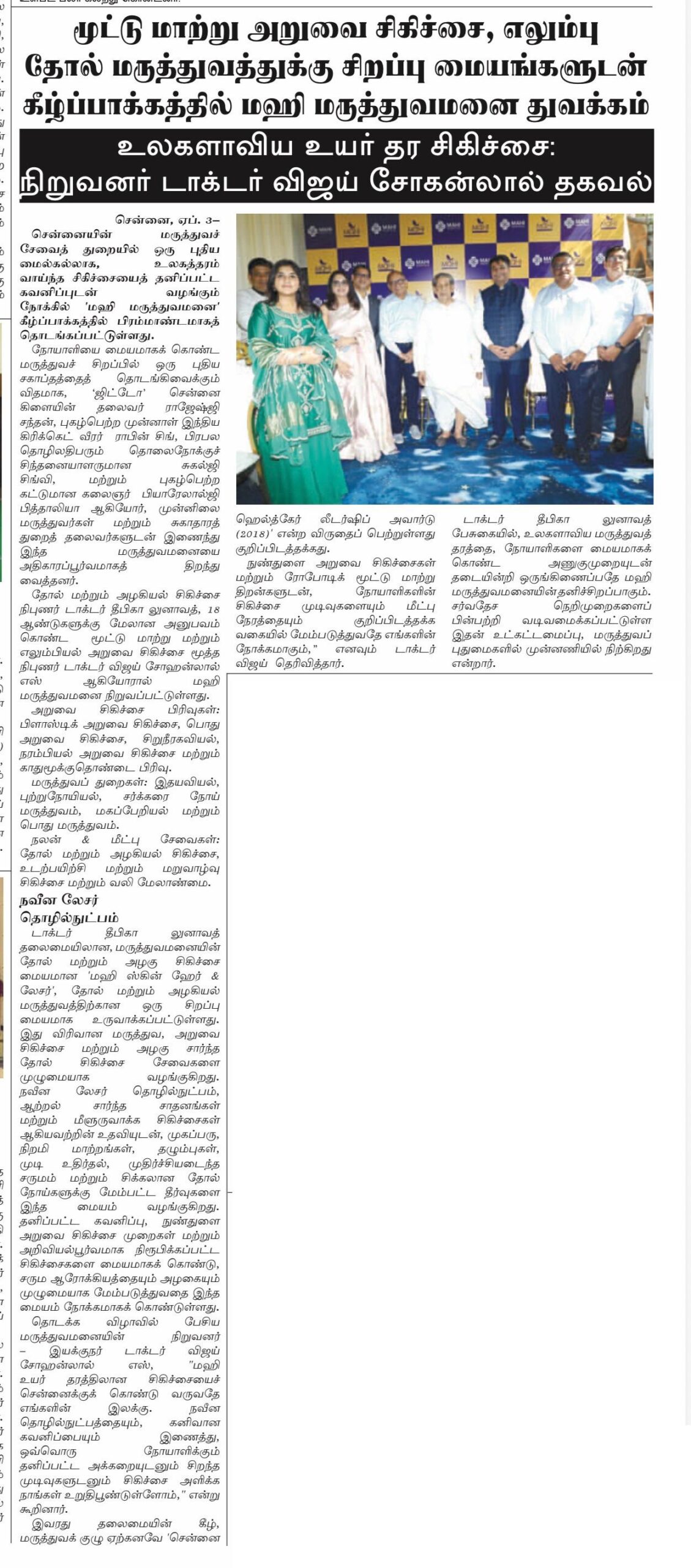 Founded by Dr. Deepika Lunawat, a specialist in dermatology and aesthetic medicine, and Dr. Vijay Kumar Sohanlal S, an experienced orthopaedic and joint replacement surgeon, the hospital brings together expertise and innovation under one roof. With over 18+ years of experience, Dr. Vijay Kumar Sohanlal is known for his proficiency in advanced joint replacement procedures and patient-centered care.